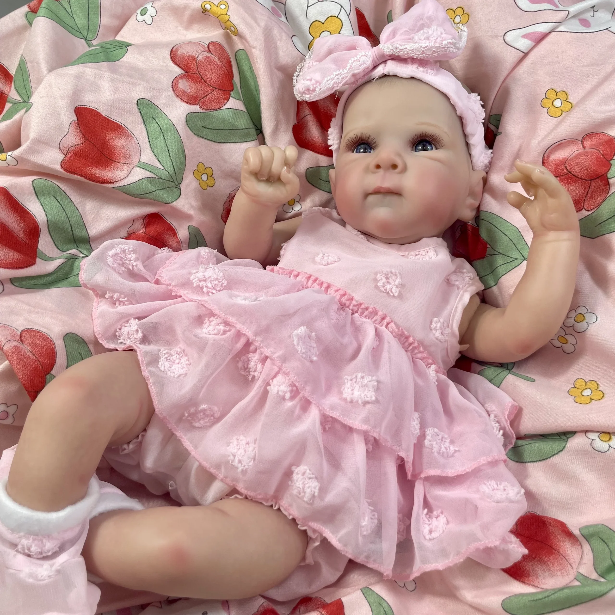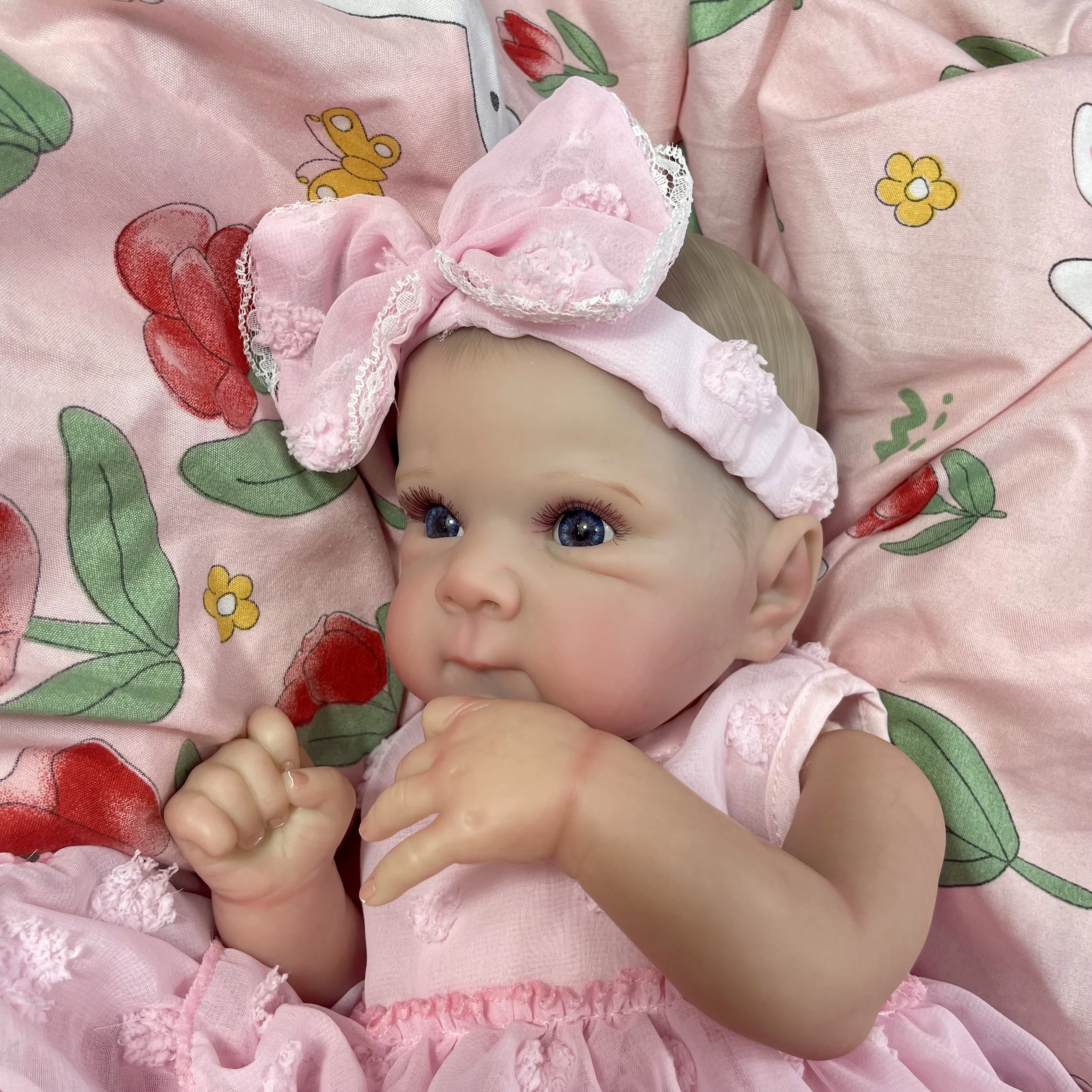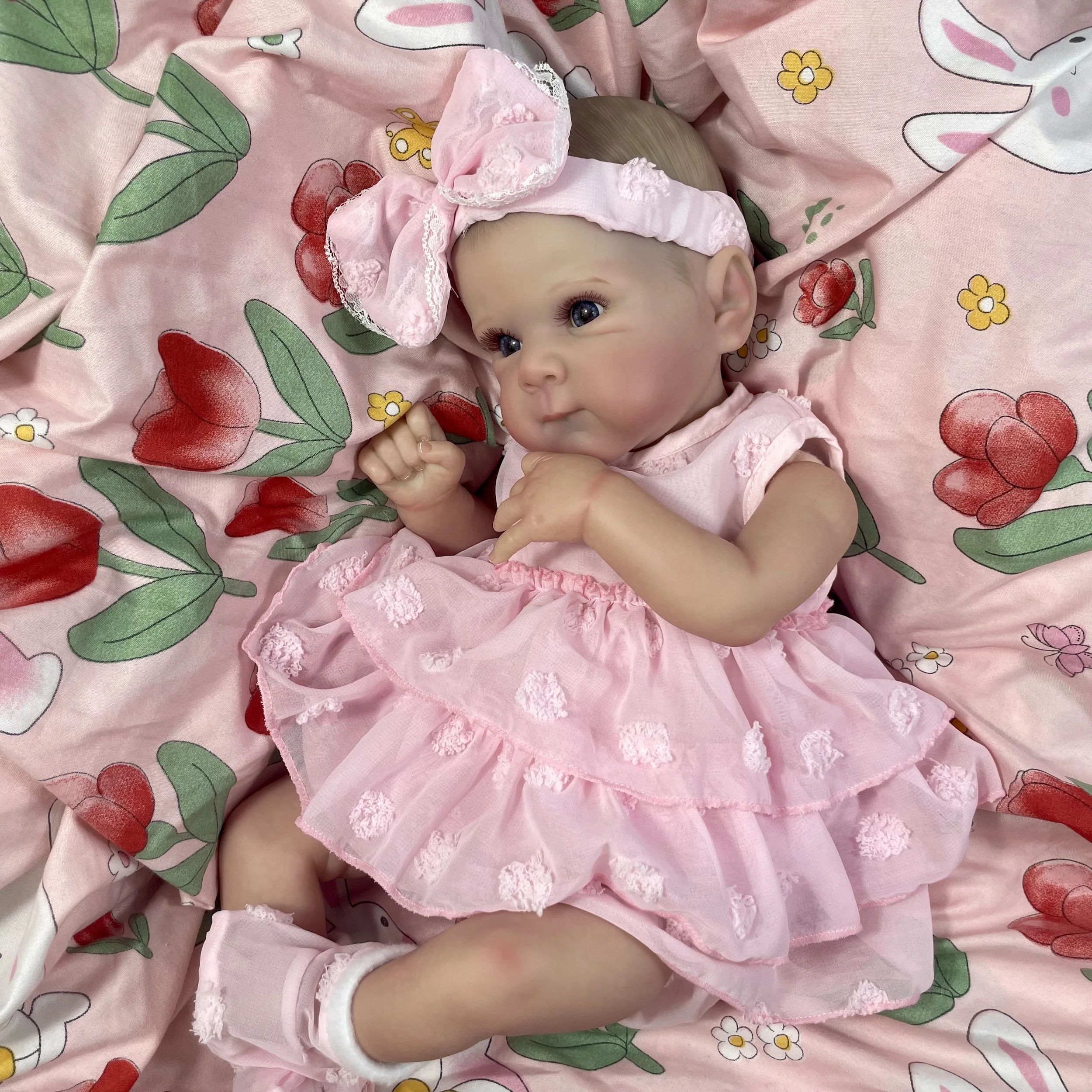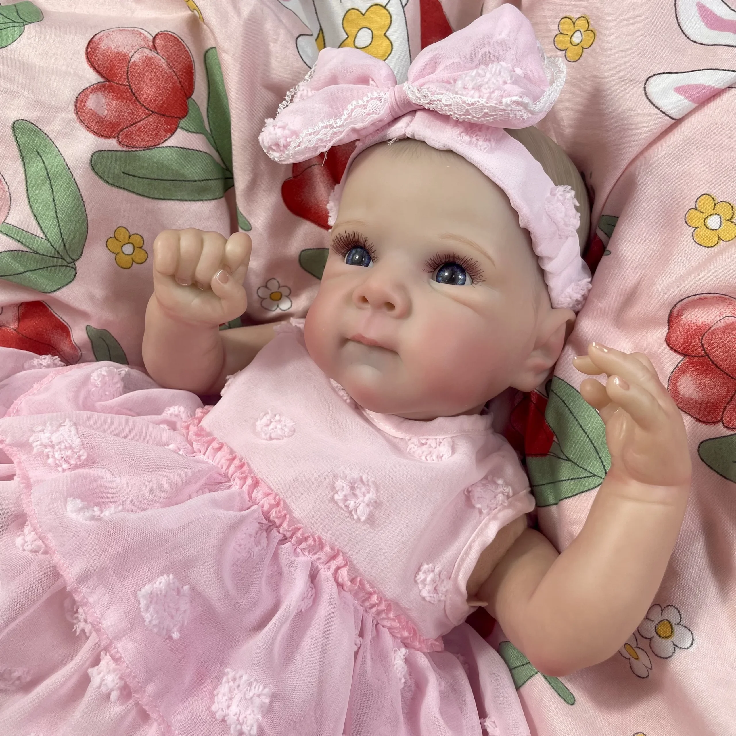 Meet the Little Blossom Baby Doll, a lifelike newborn-style doll dressed in a soft pink outfit with floral details